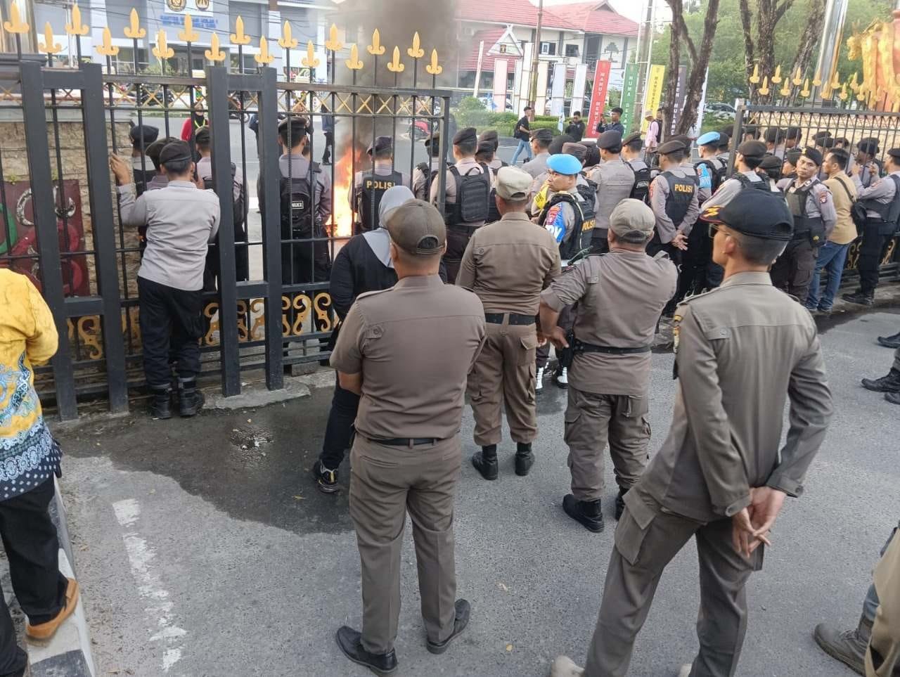 Sekitar pukul 15.30 WIB, sejumlah peserta aksi tiba di depan gerbang keluar Kantor Gubernur dan langsung membakar ban bekas serta menyampaikan orasi. Mereka menuntut agar Gubernur Kalteng dapat menemui mereka secara langsung.