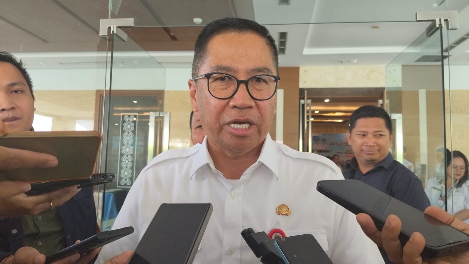 Plt. Sekretari Daerah Leonard S. Ampung saat di wawancarai oleh Media, ia menyampaikan agar para investor dan pelaku usaha yang berinvestasi di Kalimantan Tengah harus lebih peduli dengan daerah. (foto/mmckalteng)