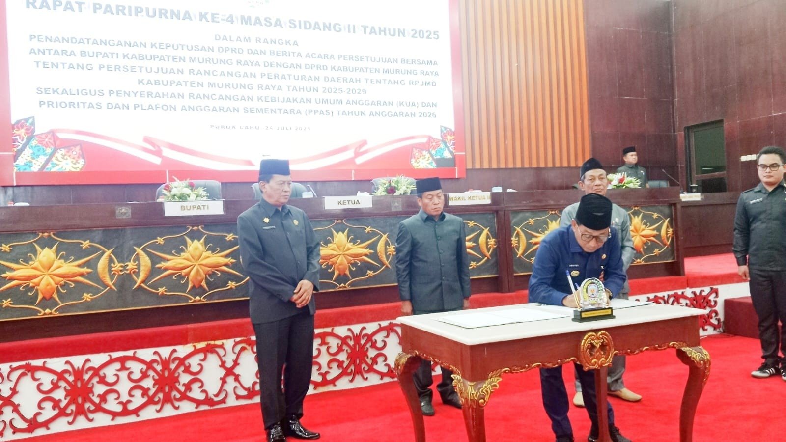 Pengesahan dilaksanakan melalui rapat paripurna DPRD Murung Raya dengan agenda penandatangan keputusan DPRD dan berita acara persetujuan bersama antara bupati dan DPRD tentang persetujuan Raperda RPJMD 2025-2029 yang dilaksanakan di ruang paripurna DPRD kabupaten setempat di Puruk Cahu. Kamis (24/7/2025).
