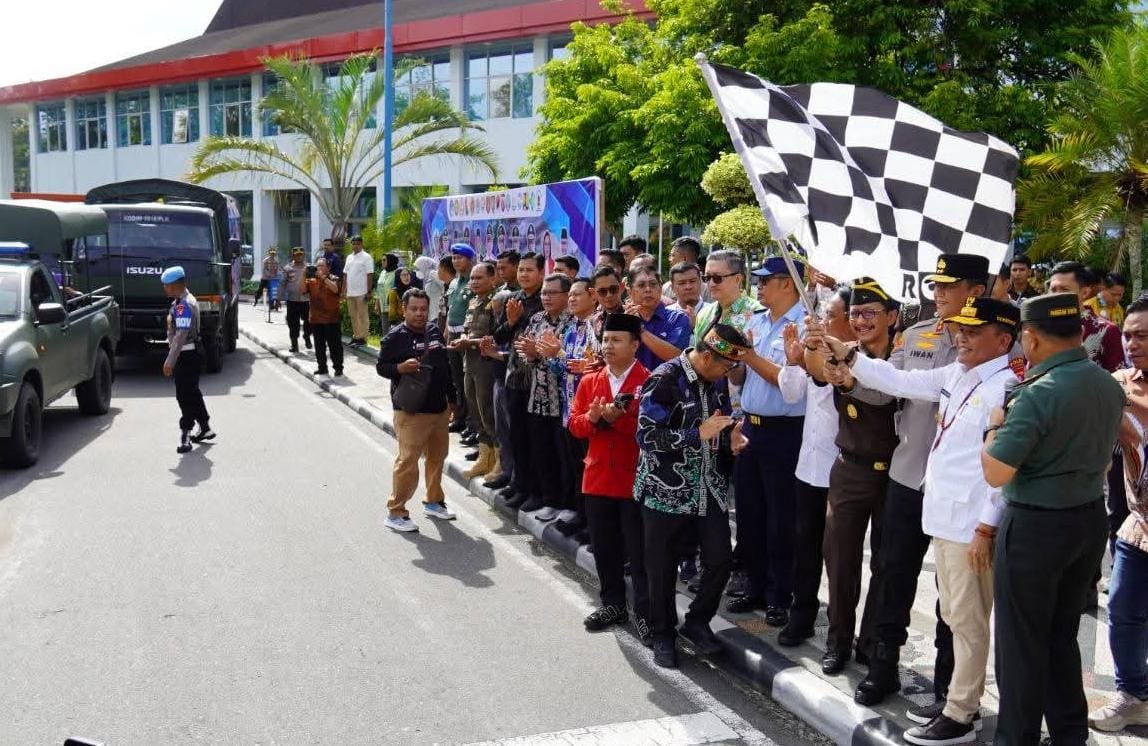 Gubernur Agustiar Sabran melepas bantuan bencana ke Aceh dan Sumatera,bersama Kapolda Irjen Pol Iwan Kurniawan, Pangdam XXII / Tambun Bungai Mayjend TNI Zainul Arifin dan Kepala Badan Intelejen Daerah di Halaman Kantor Gubernur pada Kamis (11/12/2025) pagi.  (foto/mmckalteng)