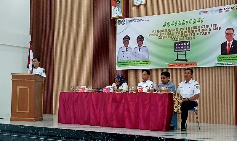 MUARA TEWEH, KALTENGTERKINI.CO.ID – Sebanyak 208 sekolah di Kabupaten Barito Utara telah menerima perangkat Interactive Flat Panel (IFP). Hal ini terungkap pada sosialisasi Penggunaan TV IFP pada satuan Pendidikan SD dan SMP di Barito utara yang berlangsung di Aula SMP Negeri 1 Muara Teweh, Rabu (14/1/2026).