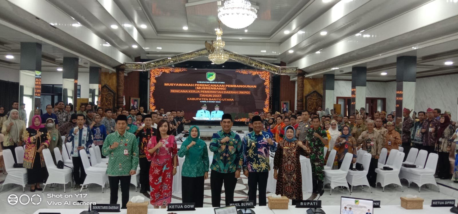 Usai membuka acara Musrenbang RKPD tahun 2027, Bupati H Shalahuddin, Wakil Bupati Felix Sonadie Y Tingan, Ketua DPRD Hj Mery Rukaini, Sekda Muhlis, Ketua TP PKK Hj Maya Savitri dan Ketua GOW Mira A. Nada Felix foto bersama dengan peserta Musrenbang RKPD tahun 2027, di gedung Balai Antang, Kamis (5/3/2026).